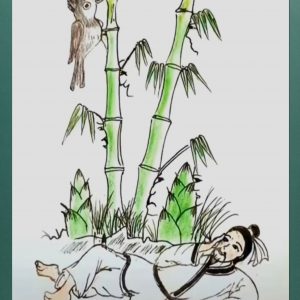 How many faces are around drunken man and bamboo?