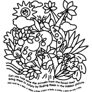 Find a deer, a rabbit, a frog, a bear, a duck, a snake, a bird, an owl, a fish.