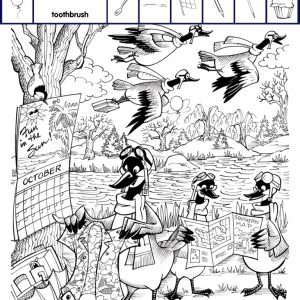 Find balloon, toothbrush, spoon, ruler, flag, pencil, needle and cupcake.