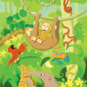 This image drops you straight into the heart of a lush green jungle where curiosity swings from every branch. A cheerful monkey hangs upside down like it…