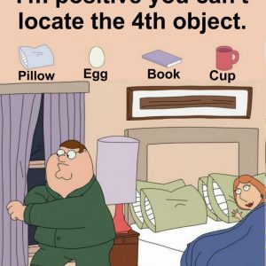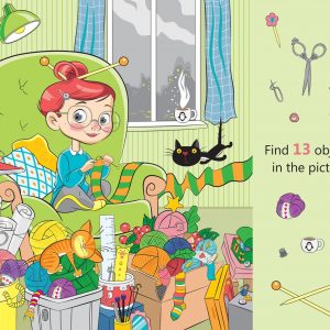 Find egg, pillow, book and cup.